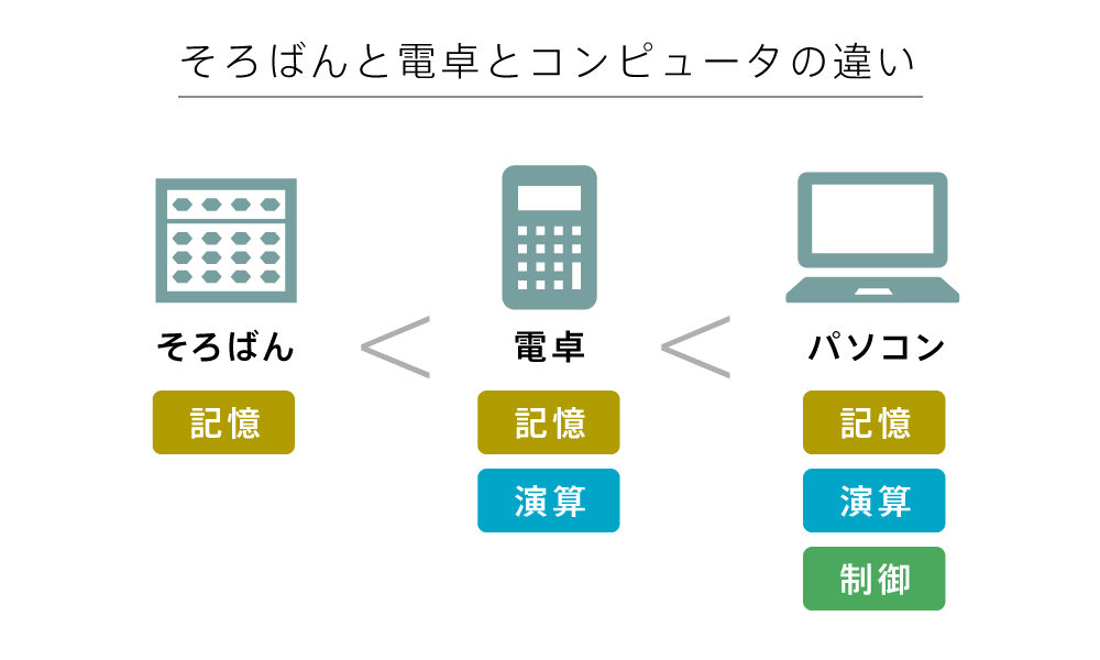 それぞれの役割について、そろばんや電卓と比較しながら確認しましょう。