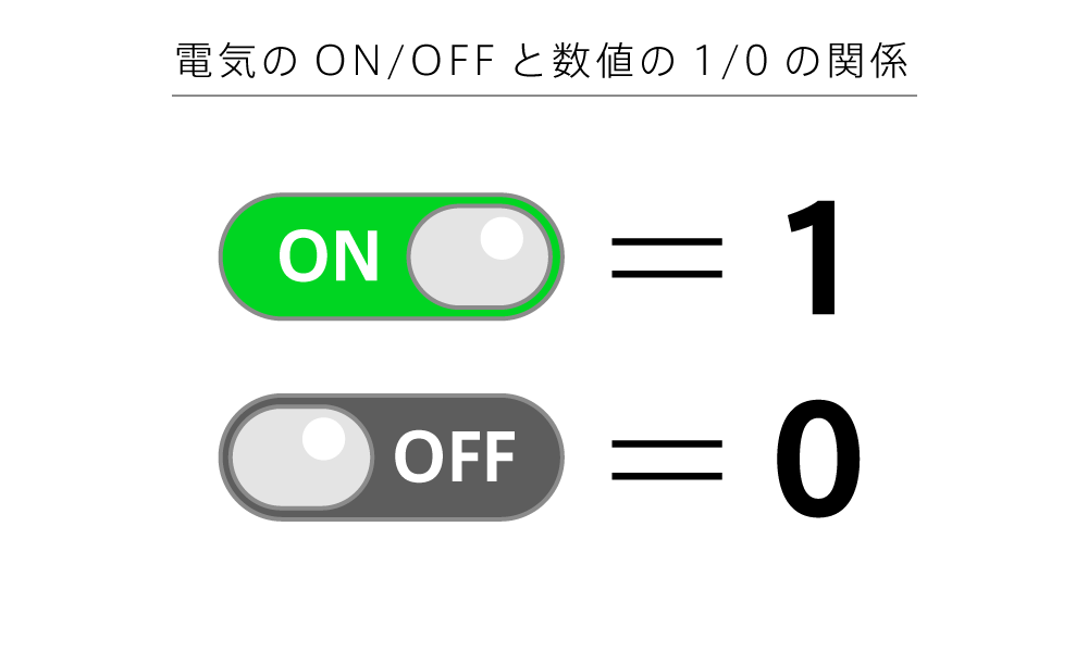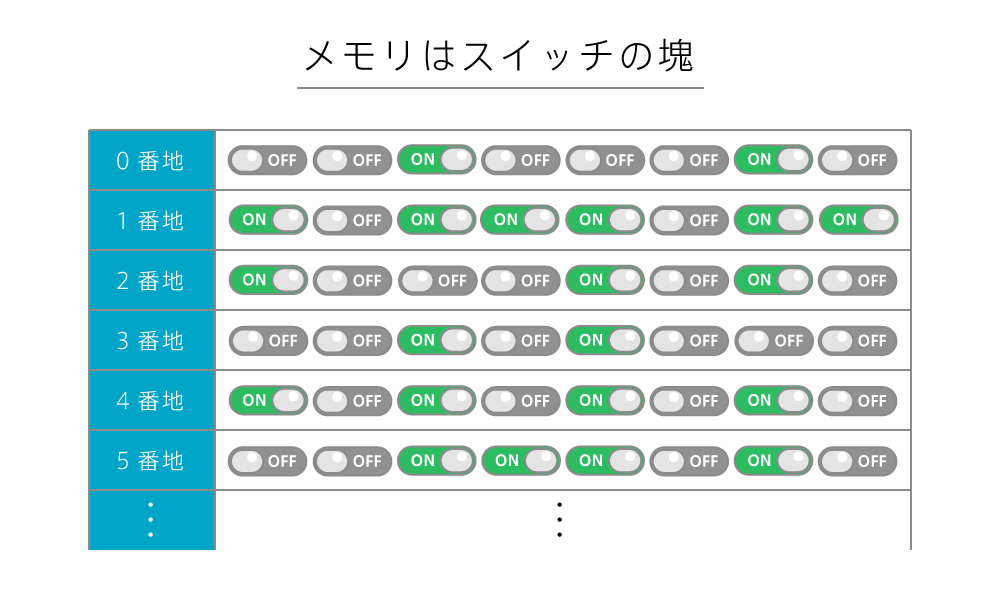 データはメモリ上に0または1の値で保持されます。つまり、メモリは膨大なスイッチで構成されており、それらのスイッチのON/OFFによって、すべてのデータが表現されているのです。