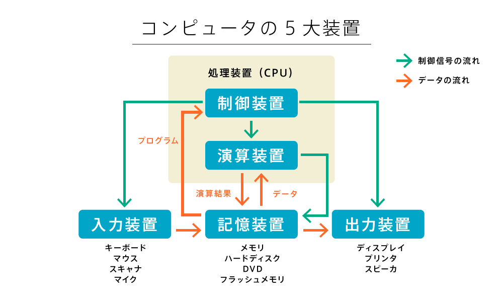 「演算装置、制御装置、記憶装置、入力装置、出力装置」のことを、コンピュータの5大装置 と呼びます。