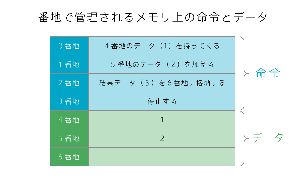 CPUはプログラムカウンタの値を参照し、そのアドレスに格納されている命令を取り出して実行します。そして命令を1つ実行するごとに、プログラムカウンタを次の命令のアドレスへ更新することで、処理を順番に進めていきます。