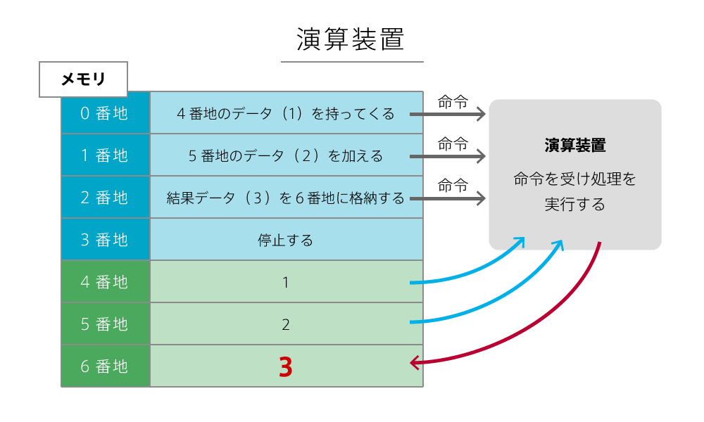 このように制御装置と演算装置は連携し、制御装置が命令を指示し、演算装置が計算を実行することで、プログラムは円滑に処理されます。