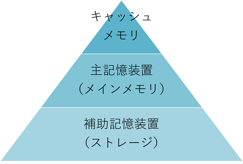 この観点では、キャッシュメモリが主記憶装置よりさらに上位に位置づけられ、次のような3階層構造となります。