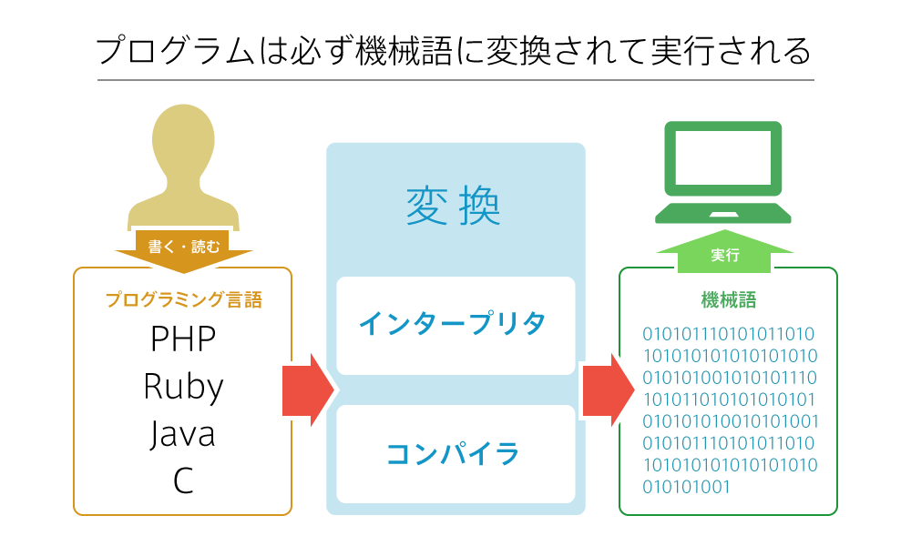 ソースコードは人間が読める形ですが、そのままでは、コンピューターは理解できません。そこで、ソースコードを機械語へ変換してコンピューターが実行できる形にする必要があります。