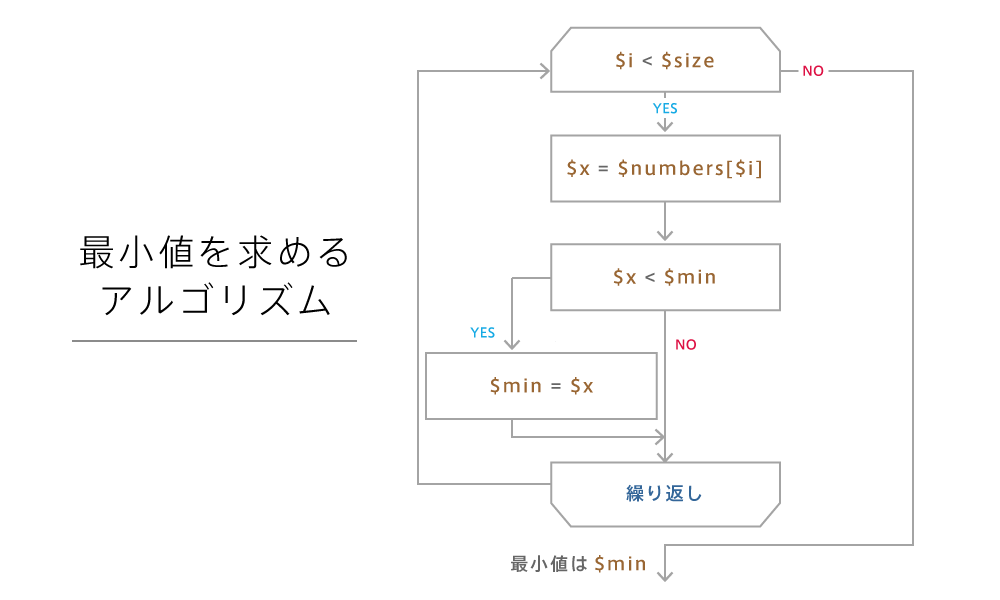 配列の最初の要素を初期値とし、配列の要素を1つずつ取り出して、より大きい(または小さい)値が見つかれば更新するのがポイントです。