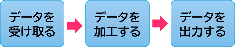 コンピューターは非常に単純で、「データを受け取って、加工し、出力する」ことしかできません。この仕組みを組み合わせることで、すべての処理を表現します。