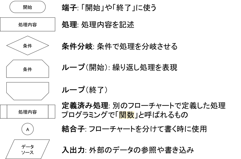 フローチャートでは、処理の開始・終了、判断、入出力などに対応した記号を使います。